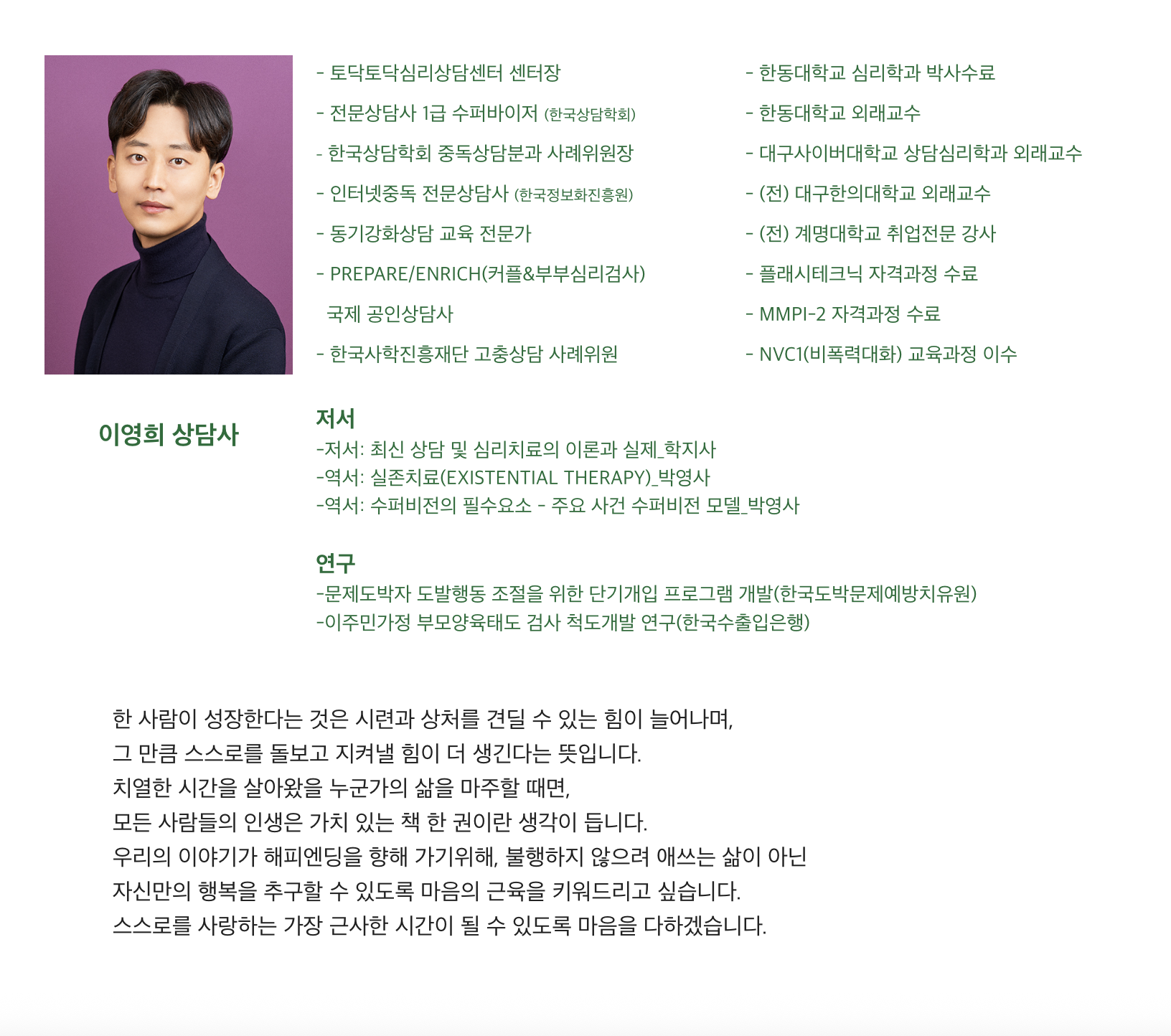 ![]() | - 토닥토닥심리상담센터 센터장 - 전문상담사 1급 수퍼바이저 (한국상담학회) - 한국상담학회 중독상담분과 사례위원장 - 인터넷중독 전문상담사 (한국정보화진흥원) - 동기강화상담 교육 전문가 - PREPARE/ENRICH(커플&부부심리검사) - 한국사학진흥재단 고충상담 사례위원 | - 한동대학교 심리학과 박사수료 - 한동대학교 외래교수 - 대구사이버대학교 상담심리학과 외래교수 - (전) 대구한의대학교 외래교수 - (전) 계명대학교 취업전문 강사 - 플래시테크닉 자격과정 수료 - MMPI-2 자격과정 수료 - NVC1(비폭력대화) 교육과정 이수 |