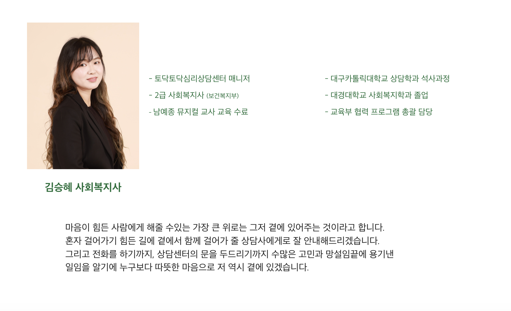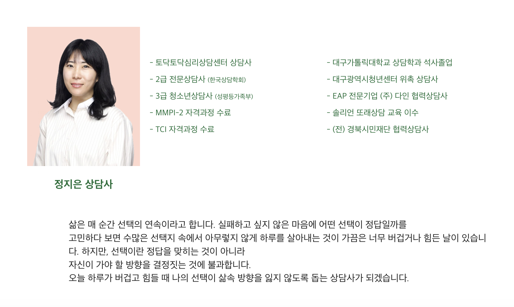![]() | - 토닥토닥심리상담센터 상담사 - 2급 전문상담사 (한국상담학회) - 3급 청소년상담사 (성평등가족부) - MMPI-2 자격과정 수료 - TCI 자격과정 수료 | - 대구가톨릭대학교 상담학과 석사졸업 - 대구광역시청년센터 위촉 상담사- EAP 전문기업 (주) 다인 협력상담사 - 솔리언 또래상담 교육 이수 - (전) 경북시민재단 협력상담사 |