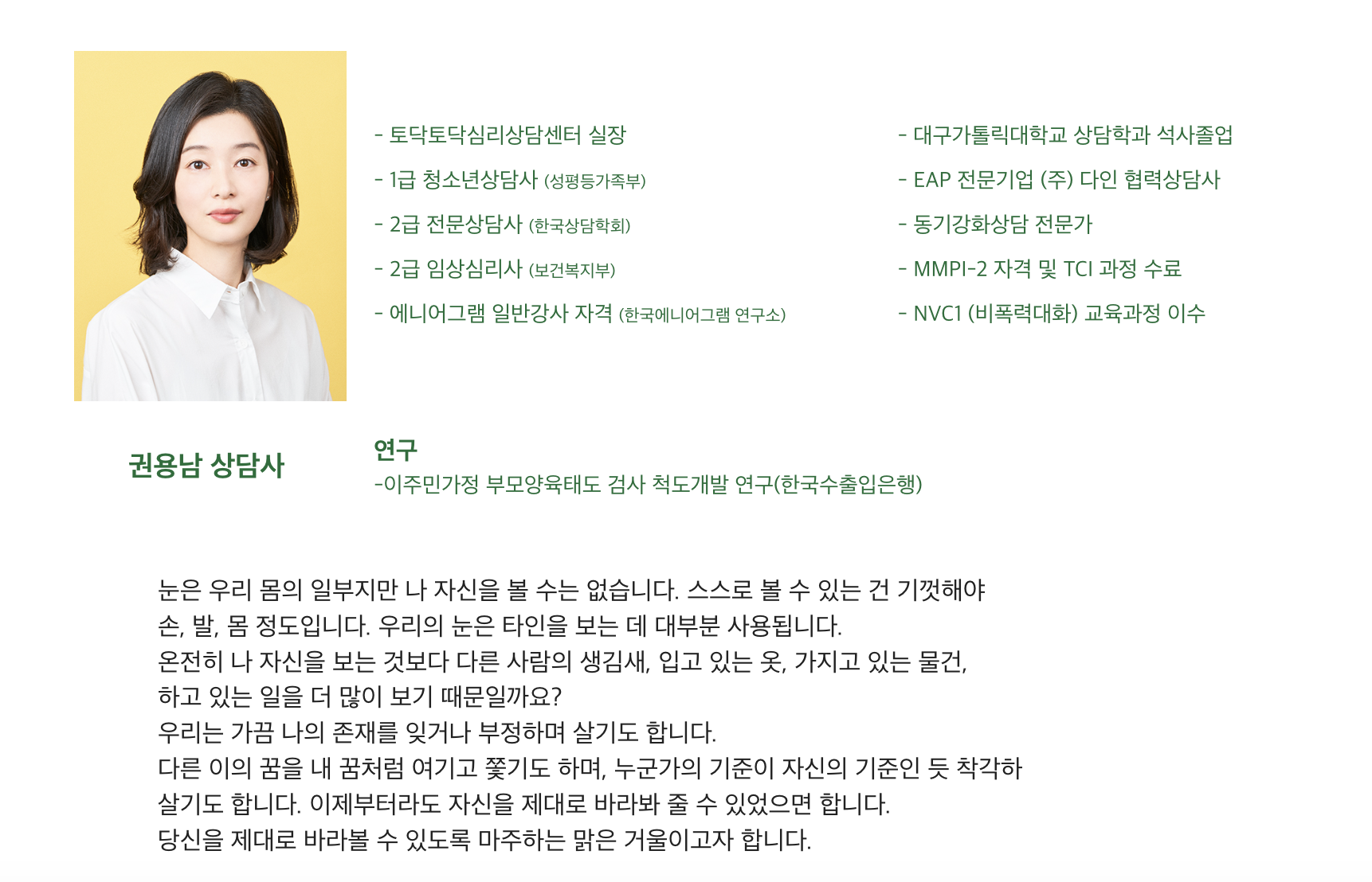 ![]() | - 토닥토닥심리상담센터 실장 - 2급 임상심리사 (보건복지부) - 에니어그램 일반강사 자격 (한국에니어그램 연구소) | - 대구가톨릭대학교 상담학과 석사졸업 - EAP 전문기업 (주) 다인 협력상담사 - 동기강화상담 전문가 - MMPI-2 자격 및 TCI 과정 수료 - NVC1 (비폭력대화) 교육과정 이수 |
