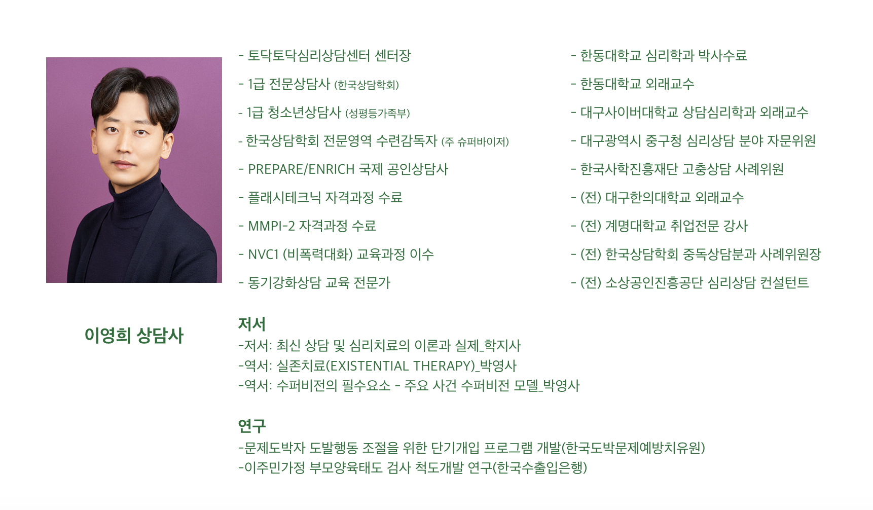 ![]() | - 토닥토닥심리상담센터 센터장 - 1급 전문상담사 (한국상담학회) - 1급 청소년상담사 (성평등가족부) - 한국상담학회 전문영역 수련감독자 (주 슈퍼바이저) - PREPARE/ENRICH 국제 공인상담사 - 플래시테크닉 자격과정 수료 - MMPI-2 자격과정 수료 - NVC1 (비폭력대화) 교육과정 이수 - 동기강화상담 교육 전문가 | - 한동대학교 심리학과 박사수료 - 한동대학교 외래교수 - 대구사이버대학교 상담심리학과 외래교수 - 대구광역시 중구청 심리상담 분야 자문위원 - 한국사학진흥재단 고충상담 사례위원 - (전) 대구한의대학교 외래교수 - (전) 계명대학교 취업전문 강사 - (전) 한국상담학회 중독상담분과 사례위원장 - (전) 소상공인진흥공단 심리상담 컨설턴트 |