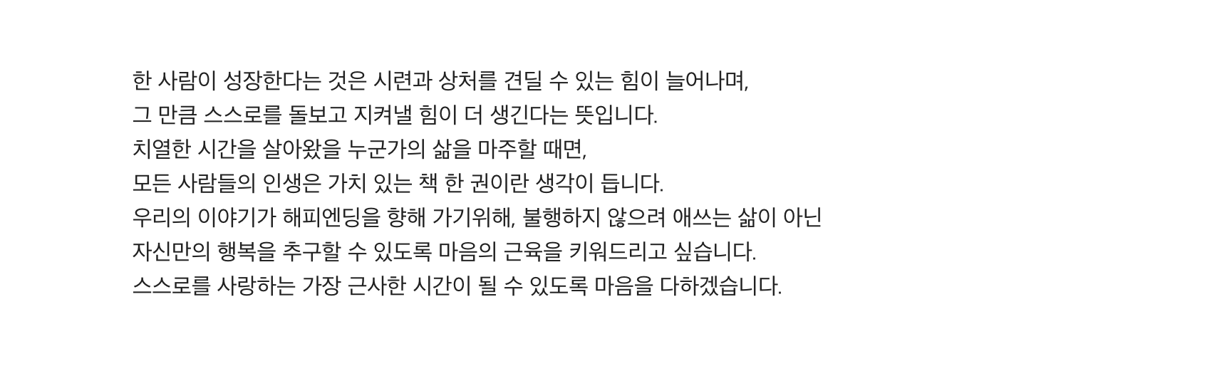 삶은 폭풍우가 지나기 만을 기다리는 것이 아닌 빗속에서 춤추는 법을 배우는 것이라는 말이 있습니다. 폭풍우를 만나지 않으면 좋겠지만 만날 수 밖에 없다면 그 속에서 멈춰 있기 보단 스스로 대처 할 수 있는 방법을 찾을 수 있다면 얼마나 좋을까요? 그러나, 그것을 혼자서 해내기란 쉽지 않습니다. 하지만, 그 시간을 함께 견뎌내고 방법을 고민 해 주는 누군가가 있다면 좌절하지 않고 춤출 수 있는 법을 배워 갈수도 있을 것입니다. 당신의 기적같은 삶이 폭풍우에 휘말리지 않을 수 있게 그 길을 함께 걸어가는 상담사가 되겠습니다. |